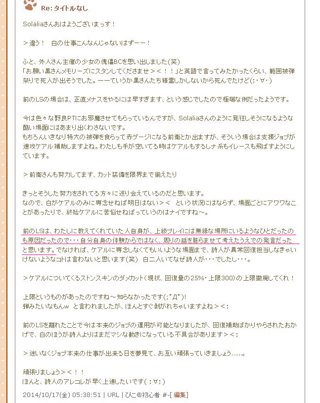 公式フォーラムを通じて入ったLSメンバーの協力によるものでありブログ内で感謝の言葉を述べてはいるが、「上級プレイには無縁な場所にいるひと」「メナスをやるには早すぎる」レベルのLSとして脱退。